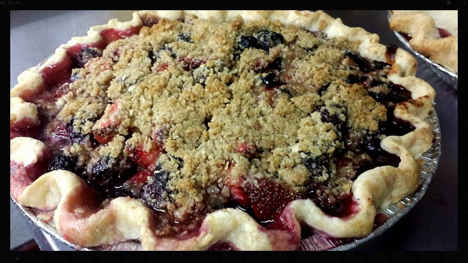 Blend of fresh berries, (a combination of three of the following: blackberries, blueberries, raspberries, strawberries) baked in a flaky double crust or a crumble top. So good with vanilla ice cream!