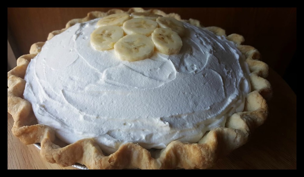 Creamy, cool, and yummy banana filling with sliced bananas in a flaky crust and piles of whipped cream topped with fresh sliced bananas.