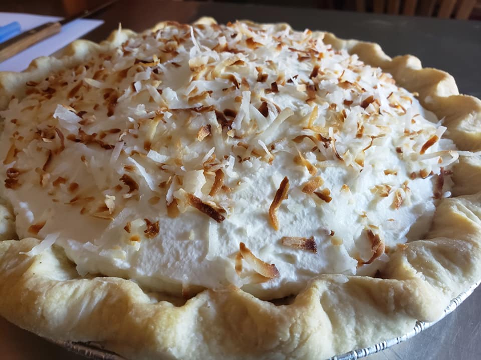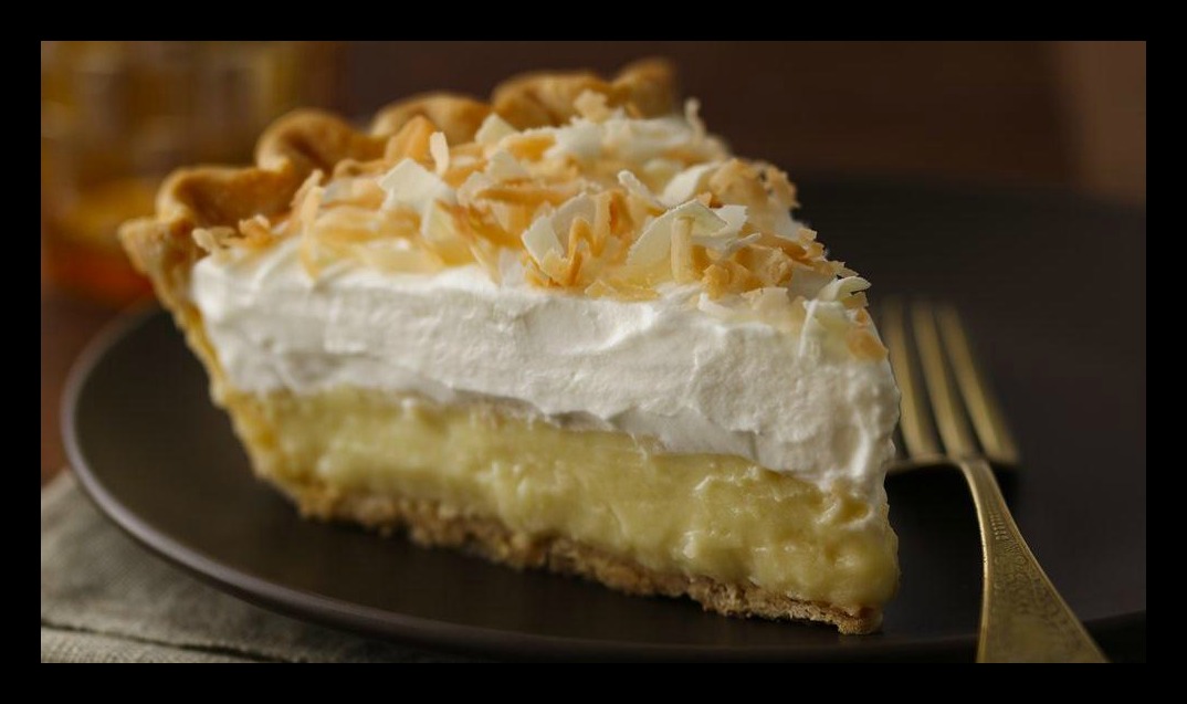 Cool, creamy, old-fashioned coconut-filled custard in a light, flaky crust and topped with lots of whipped cream and toasted coconut.