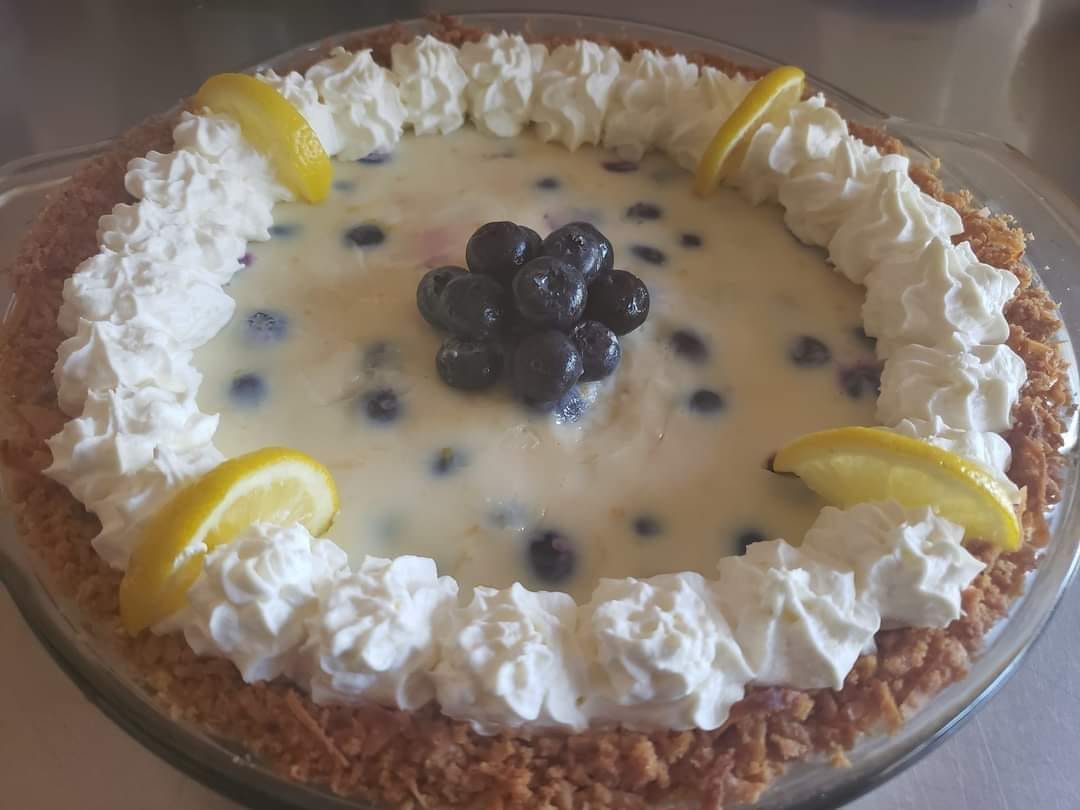 Creamy Lemon with fresh blueberries throughout, baked in a coconut cookie crust, topped with more blueberries, fresh whipped cream and lemon slices. Very springy!!