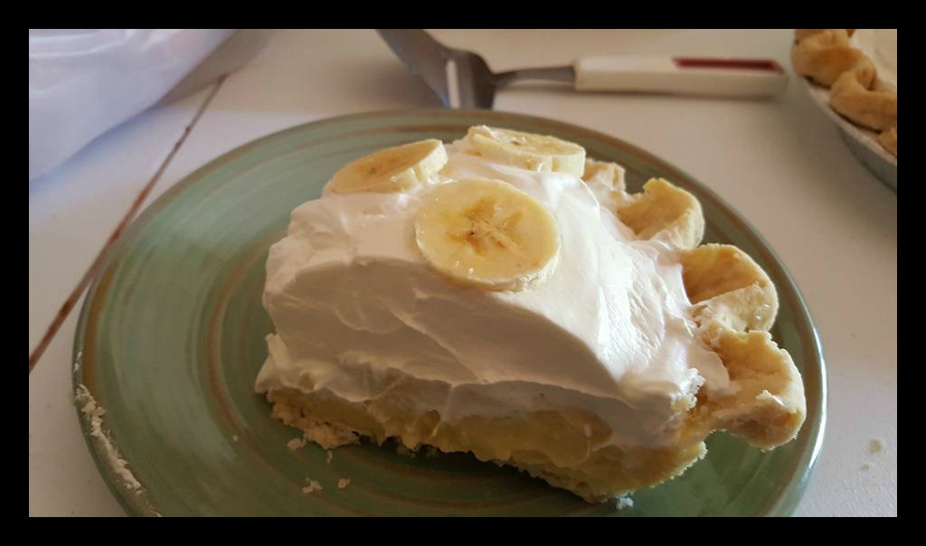 Creamy, cool, and yummy banana filling with sliced bananas in a flaky crust and piles of whipped cream topped with fresh sliced bananas.