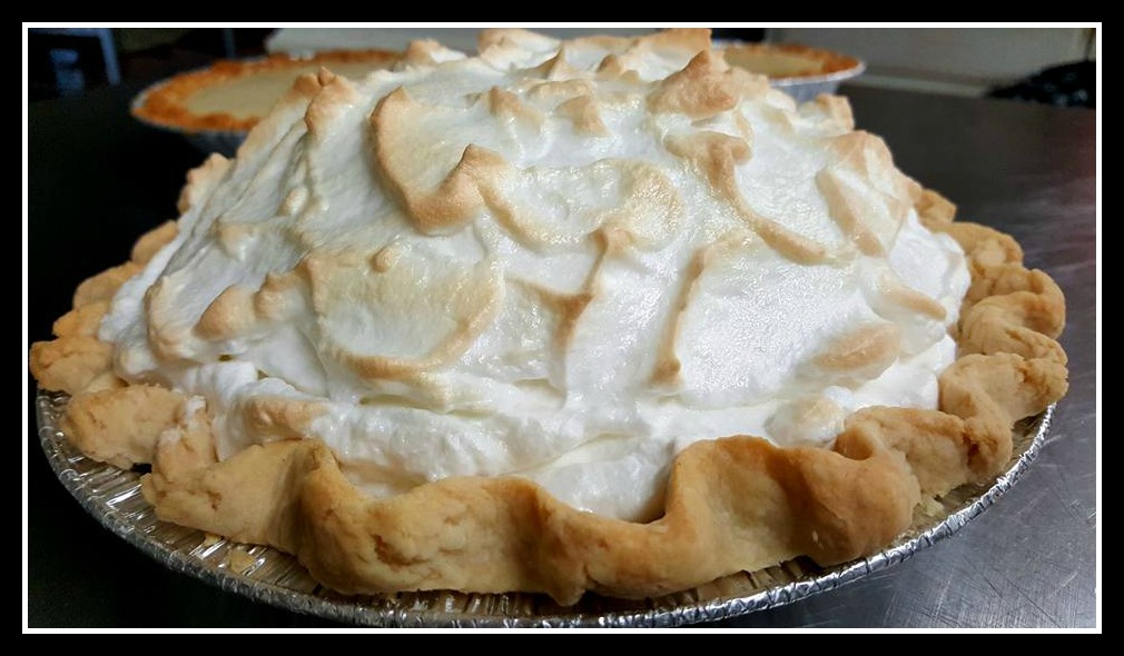 A favorite! Creamy and tangy made with fresh Meyer lemons, in a coconut cookie crust and topped with a real whipped cream.